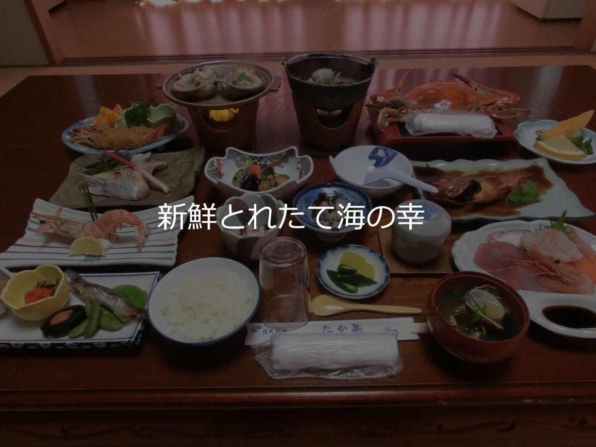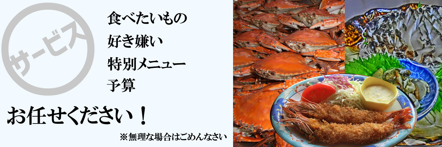 新鮮とれたて海の幸をその日に市場で仕入れてきます。冷凍加工品は一切使用しません。その時々の旬の味を、一番おいしい調理方法でお楽しみください。小さい宿だからこそできる鮮度勝負。絶品海の幸を”大盤振る舞い”いたします。 好き嫌いやメニューについてはなんでもご相談ください。 子どもの合宿だからカレーで!お祝いだから豪華に船盛りにして!なんてご相談もOKですよ。